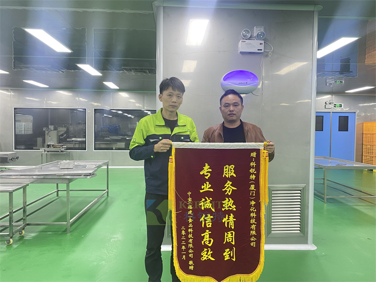 项目组魏俊强经理代表千亿国际对中宝食品赠送锦旗表示衷心感谢,这是对千亿国际在净化工程发展上的高度荣誉,更是一种新的使命。同时也祝中宝食品蓬勃发展,日胜一日。